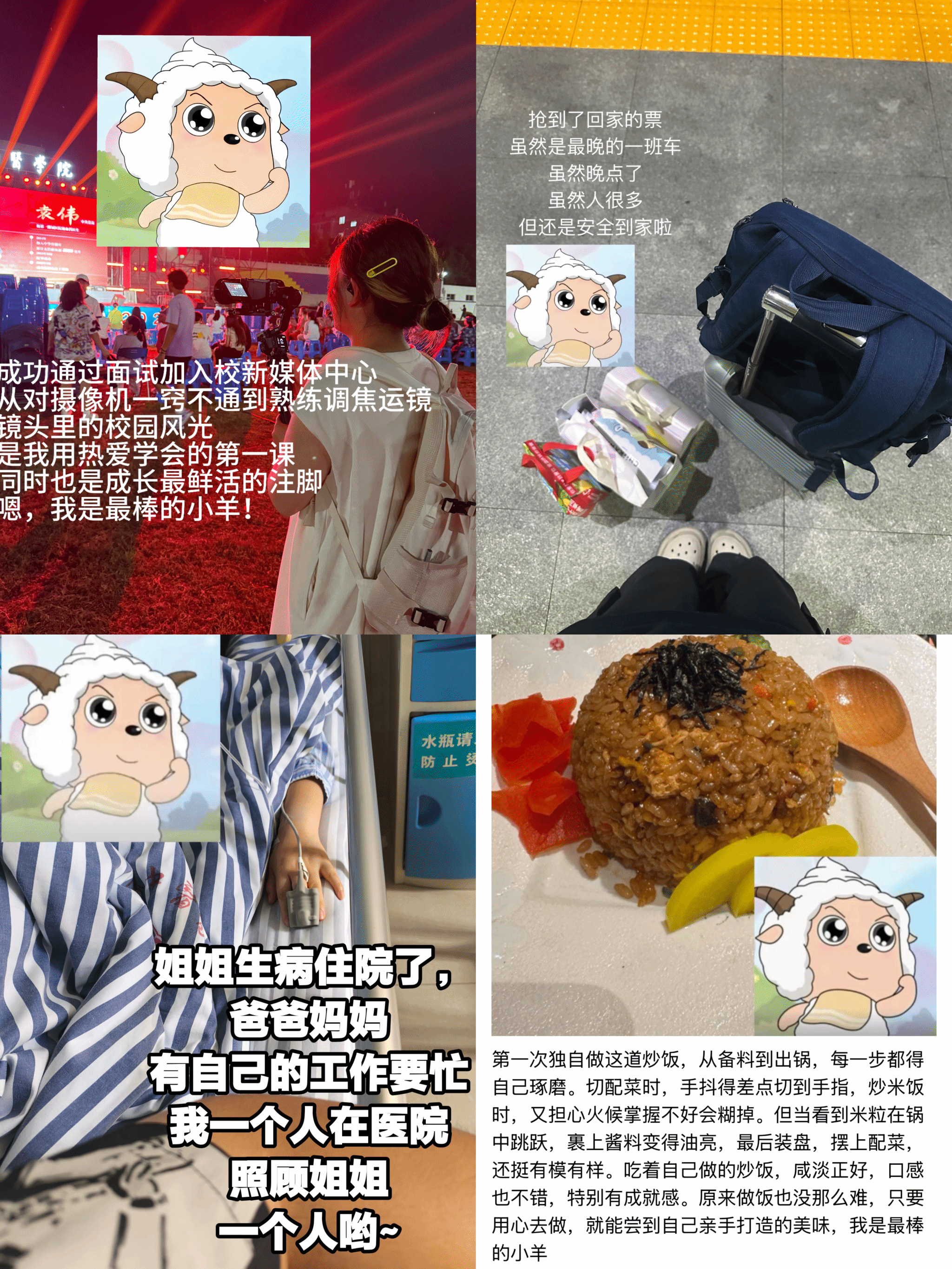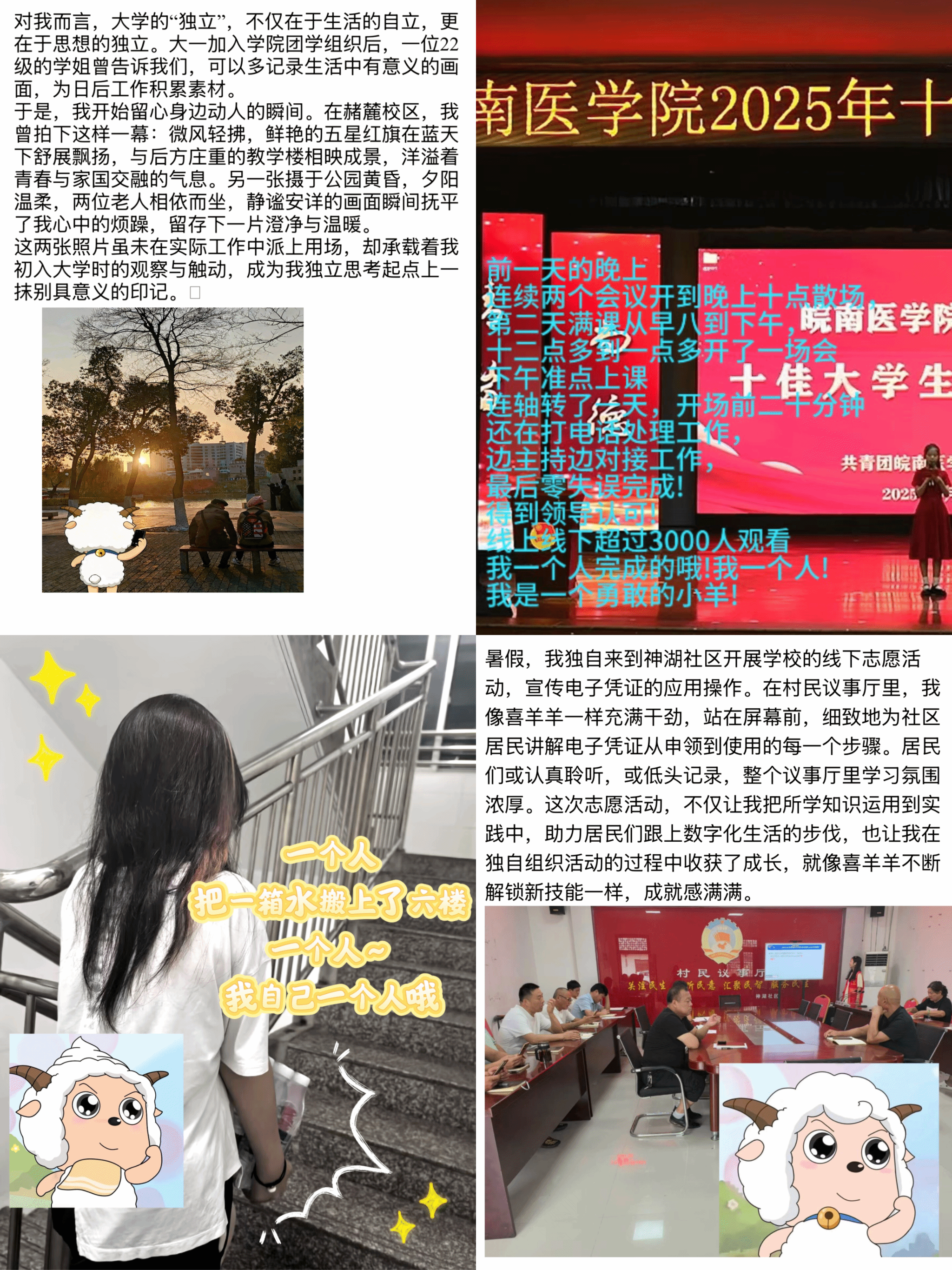 为了鼓励学生记录和分享大学期间从依赖走向独立的成长历程,365英国上市网站官网于9月26日至10月2日面向全院学生开展“小羊成长记·我的独立图鉴”图文征集活动,活动旨在记录同学们离开家乡、开启大学生活后的成长历程,包括独立适应校园生活、独自就医、参与志愿服务、投身科技项目等多方面经历。这些点点滴滴的成长印记,如同一只只小羊离开母羊庇护、逐渐独立的过程,展现了当代大学生在陌生环境中勇敢前行的精神风貌。