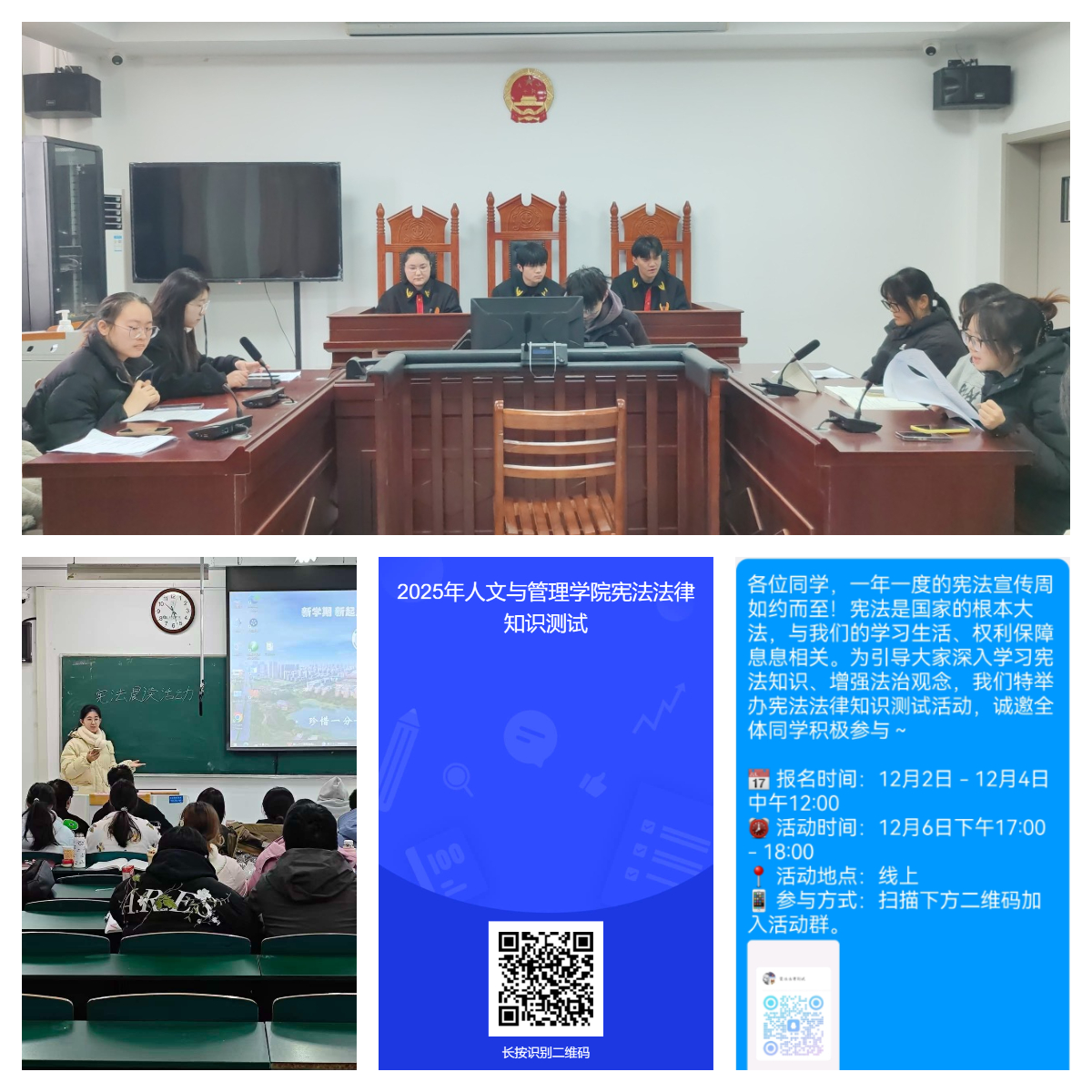 12月5日,学院举办大学生模拟法庭审判活动,该审判围绕“从35周岁到38周岁——公务员报考年龄调整的宪法分析”这一主题展开,原告方与被告方围绕公务员报考年龄限制规定是否侵犯公民平等权与劳动权这一议题,展开激烈辩论。通过沉浸式、观摩式的“模拟法庭”活动,让学生切身感受法律的威严,提升学法、知法、懂法的能力。此外,365英国上市网站官网组织宪法法律知识测试以及共度一段“宪法晨读”时光活动,有效深化广大师生对宪法精神的理解,夯实了宪法知识储备,筑牢了宪法知识根基,提升了宪法实践素养。